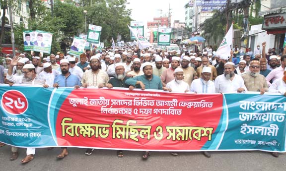 কেন্দ্র ঘোষিত কর্মসূচির অংশ হিসেবে ৫- দফা দাবিতে বাংলাদেশ জামায়াতে ইসলামী নারায়ণগঞ্জ মহানগরীর উদ্যােগে বিক্ষোভ সমাবেশ ও মিছিল অনুষ্ঠিত হয়েছে। ২৬ সেপ্টেম্বর শুক্রবার বাদ জুম’আ নারায়ণগঞ্জ শহরের মিশনপাড়া মোড় থেকে